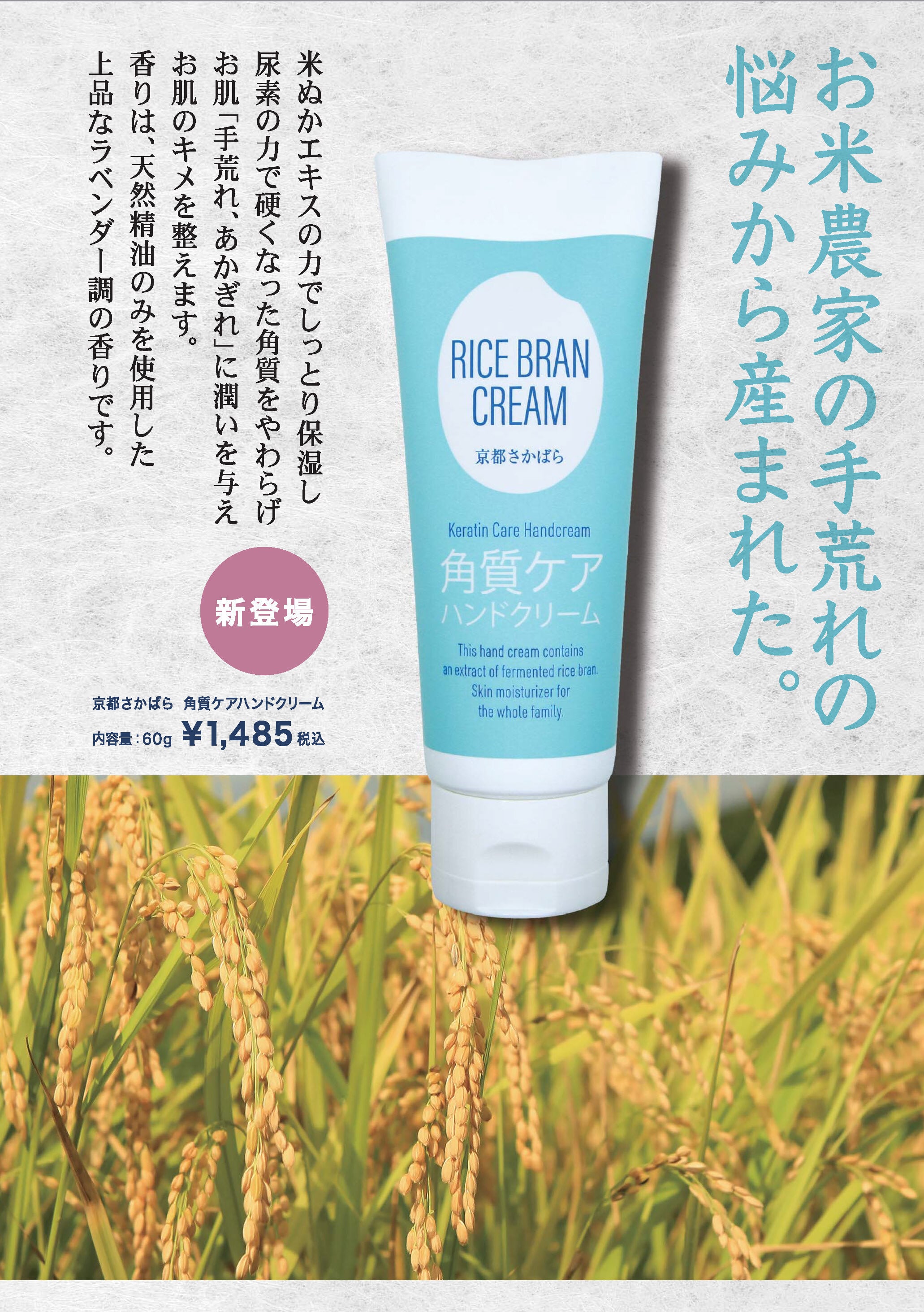 京都岩倉さかばらにて「手荒れ、あかぎれ」に悩む農家さんから相談を受けて、何度も試作を重ねて開発されたハンドクリームです。尿素の力で硬くなった角質をやわらげ、米ぬかエキスの力でしっとりと保湿。手荒れやあかぎれに潤いを与えお肌のキメを整えます。かかと、ひじ、膝にもご使用いただけます。